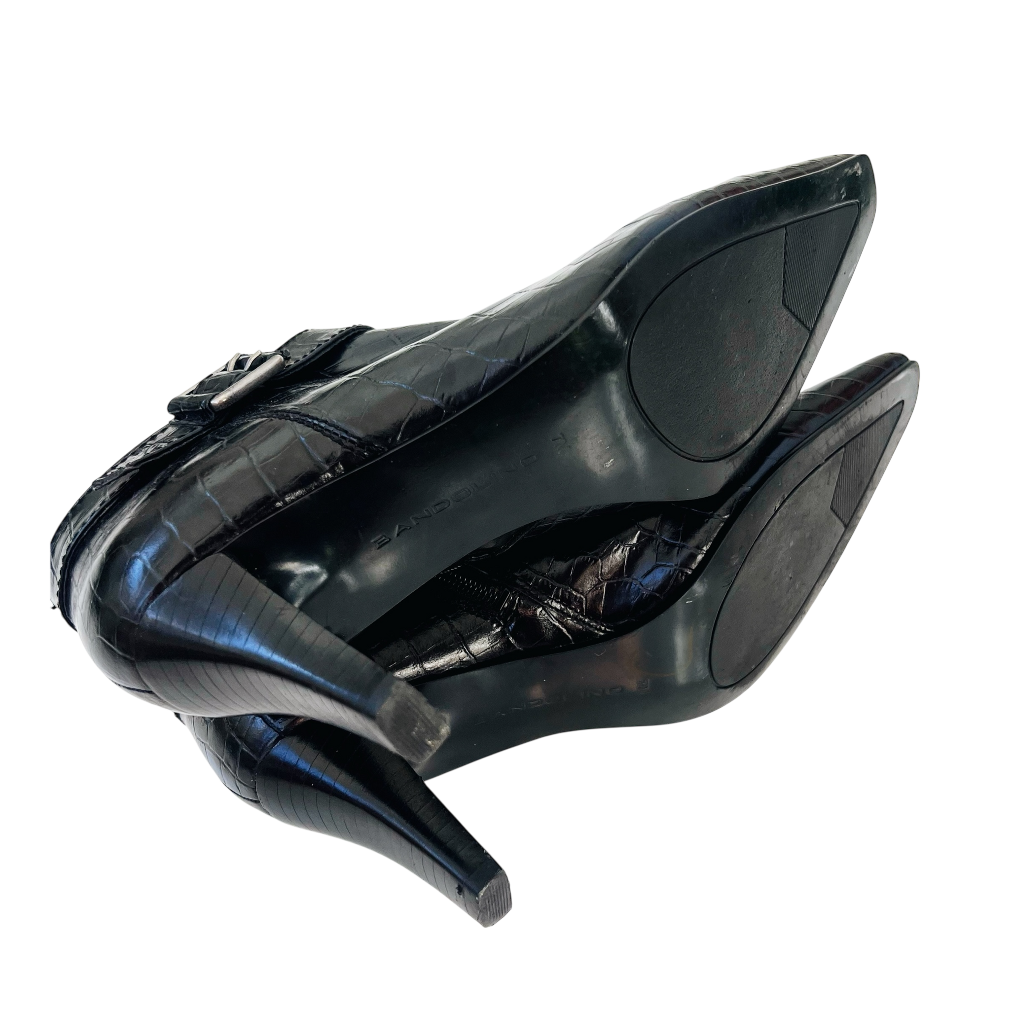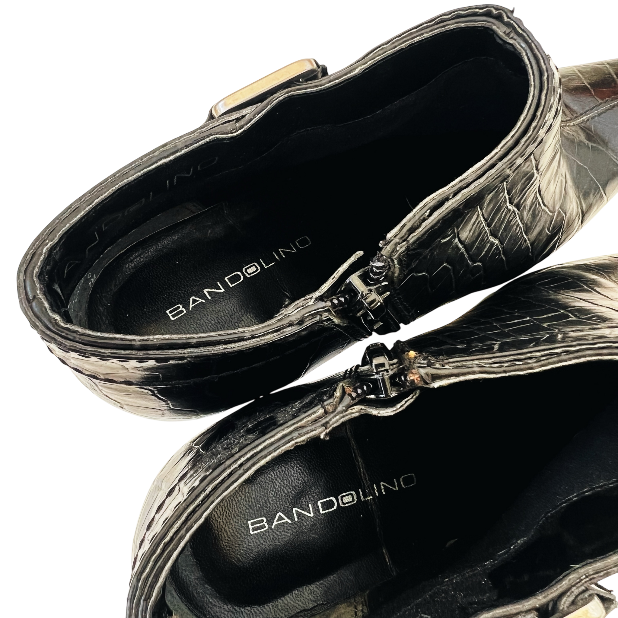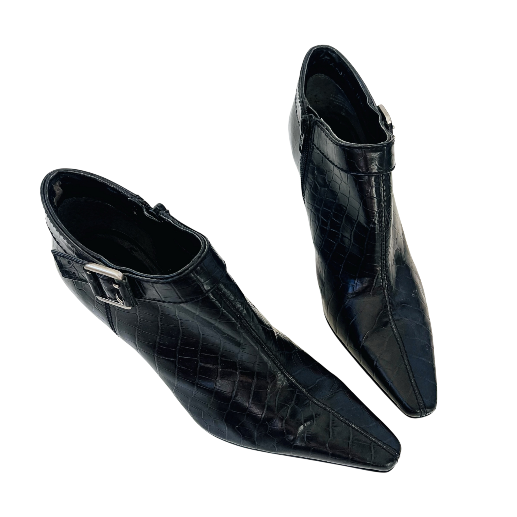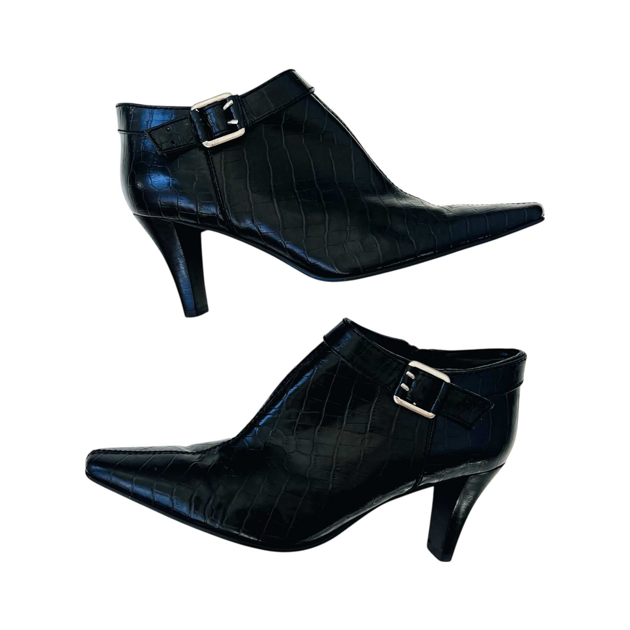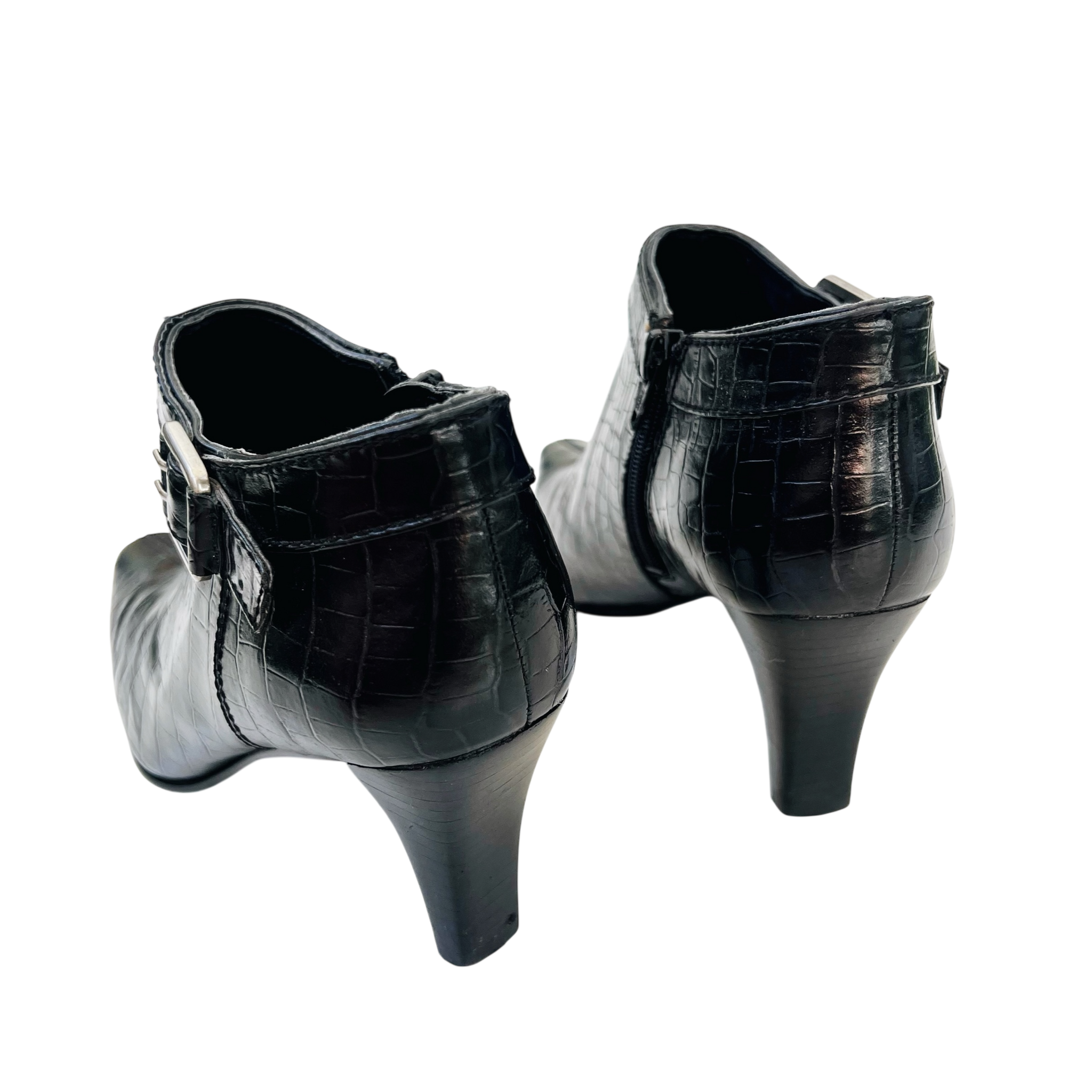 Black leather croc-patterned heeled ankle booties with silver toned buckle details!