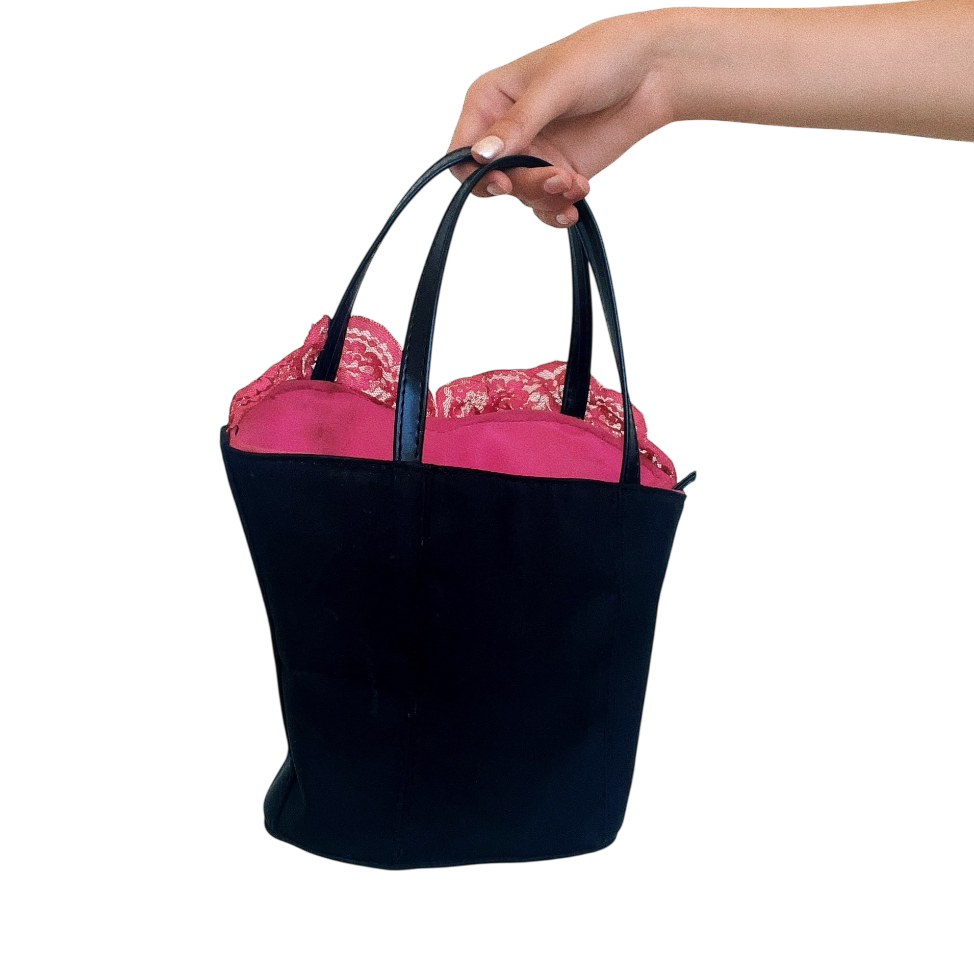 Vintage black corset shaped mini purse featuring a Marilyn Monroe graphic and hot pink lacy details!