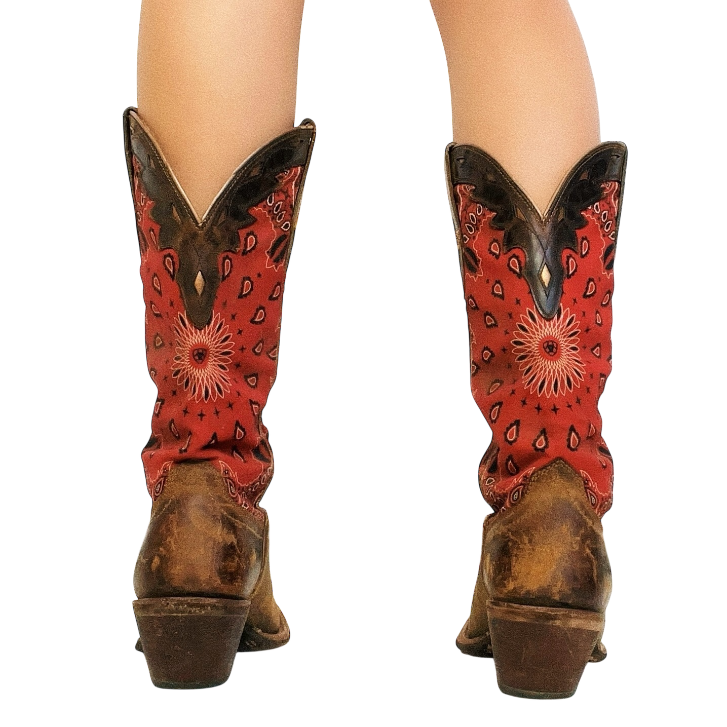 Distressed leather cowboy boots with red paisley bandana print!