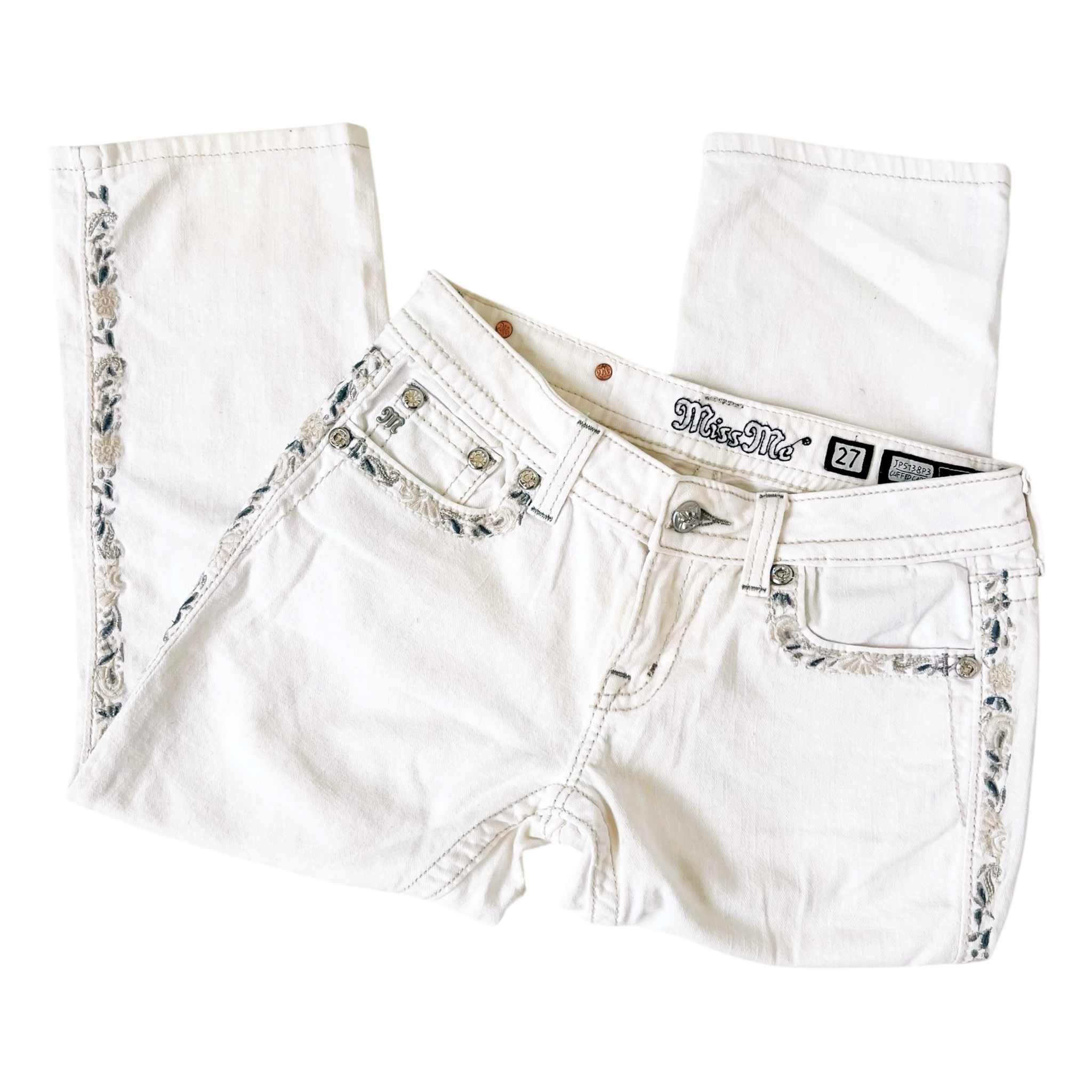 White denim capris with floral embroidered details, silver toned hardware and rhinestone embellishments!