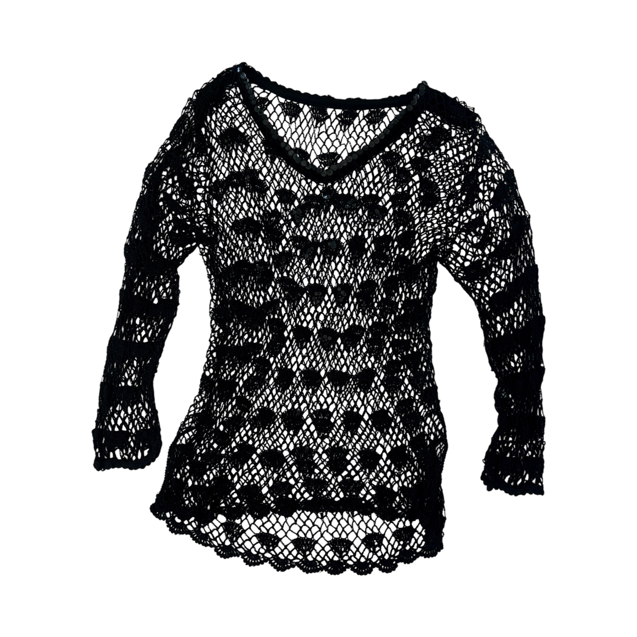 Black open-knit longsleeve crochet top with sequin/beaded details!