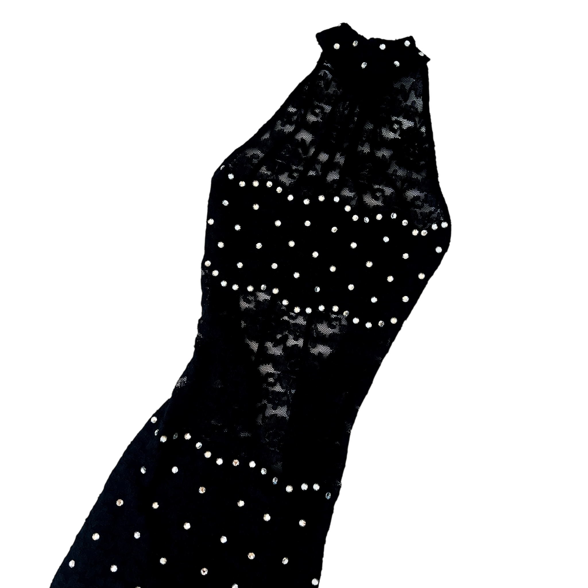 Rare find! Vintage sheer lacy black maxi dress with rhinestone embellishments.