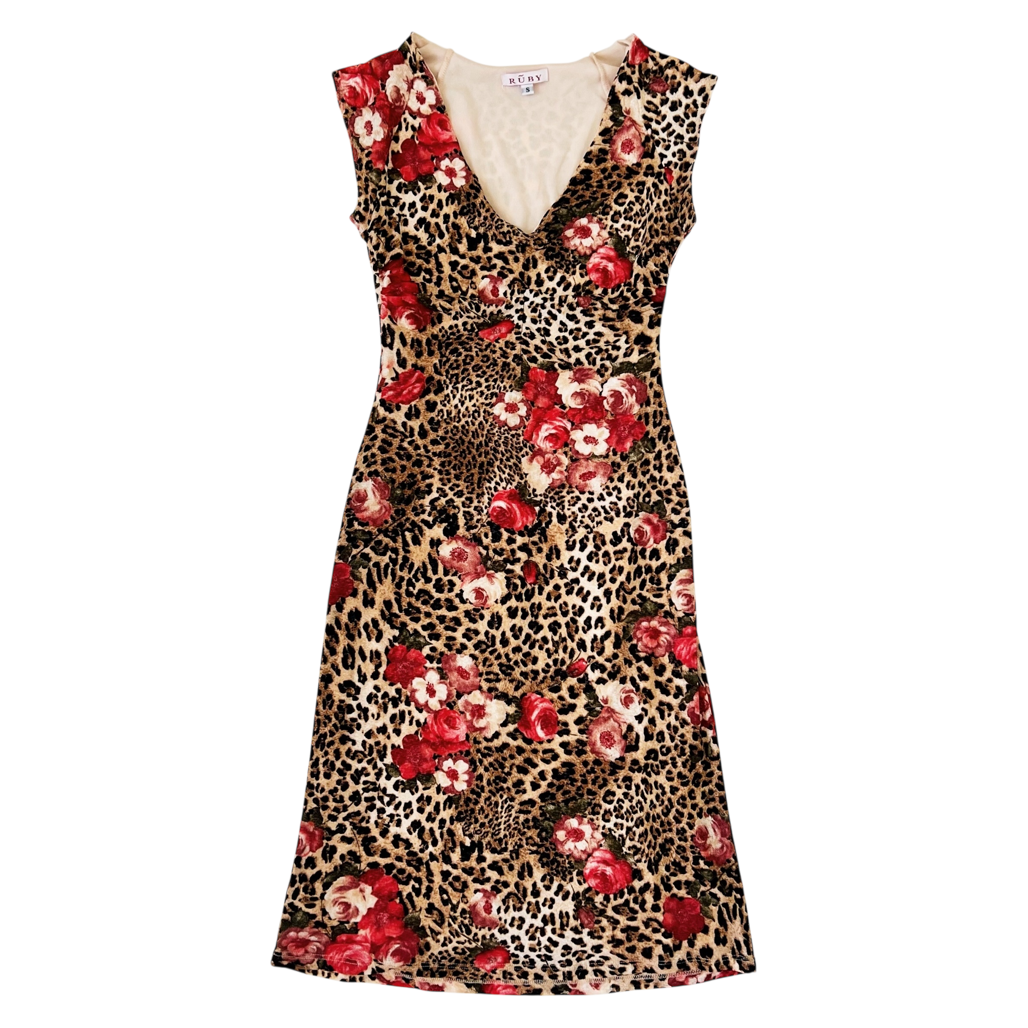 90s vintage knee-length dress in a fun mix of leopard and floral prints!