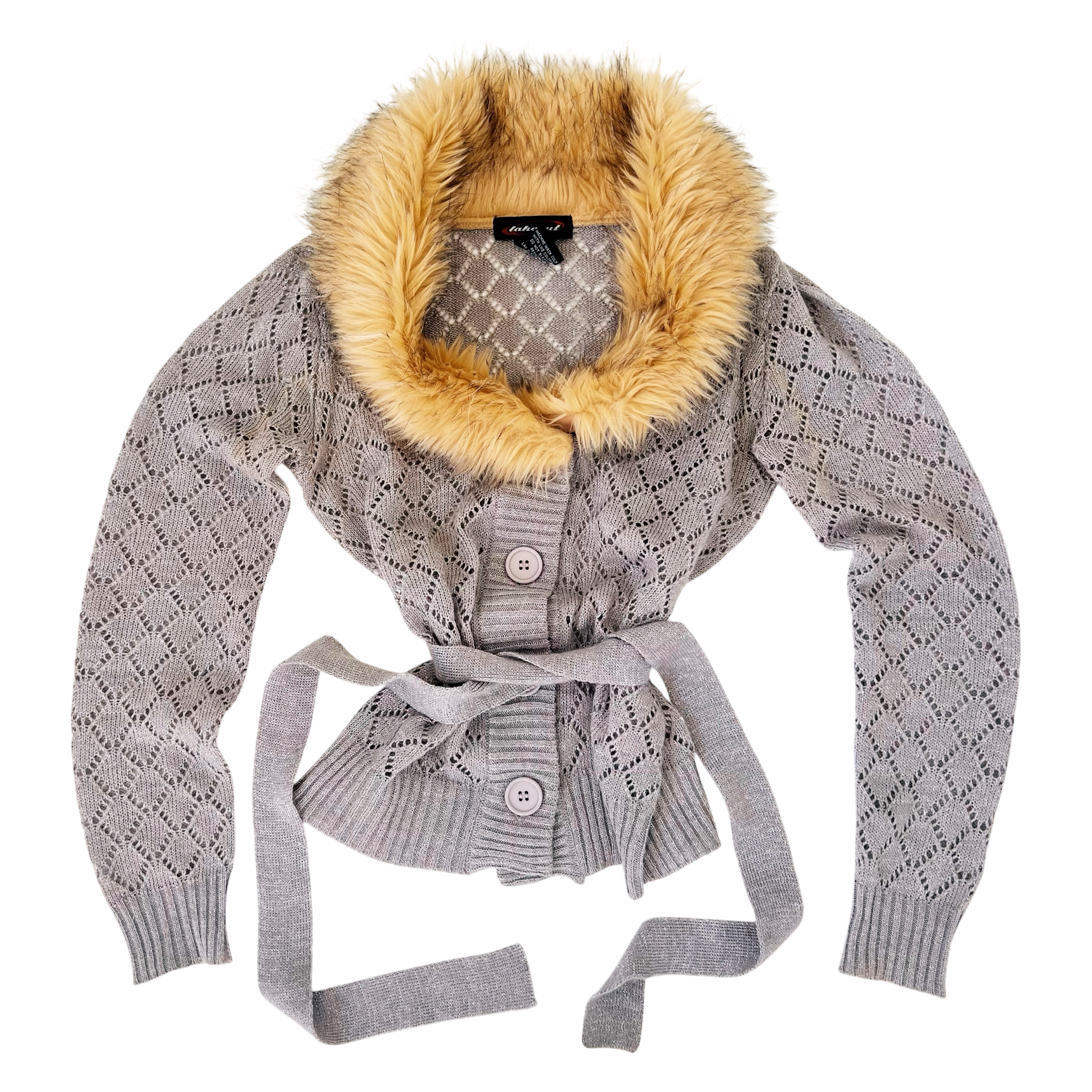 Early 2000s gray knit cardigan with subtle silver sparkle and a faux fur collar!
