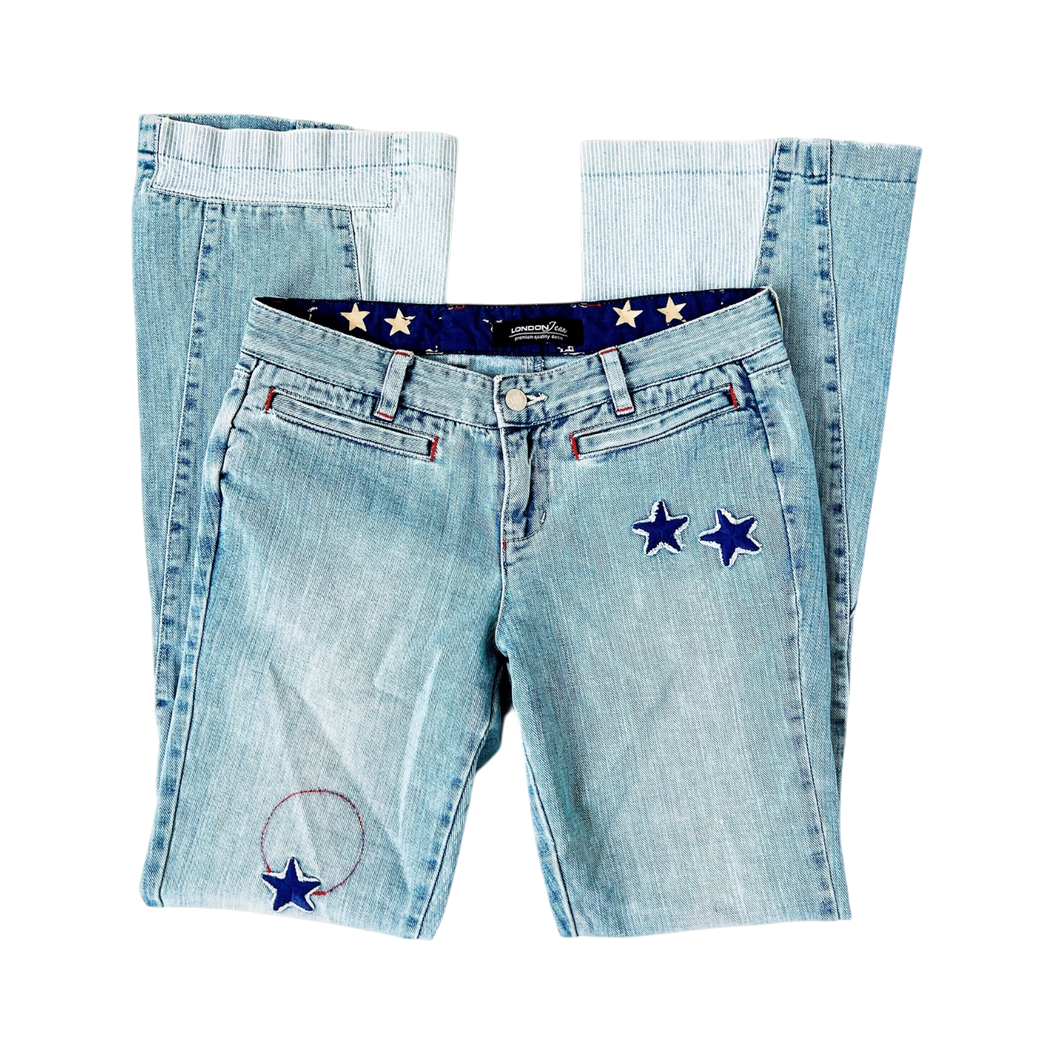 Cutest flare jeans with pinstriped patches and blue embroidered stars!