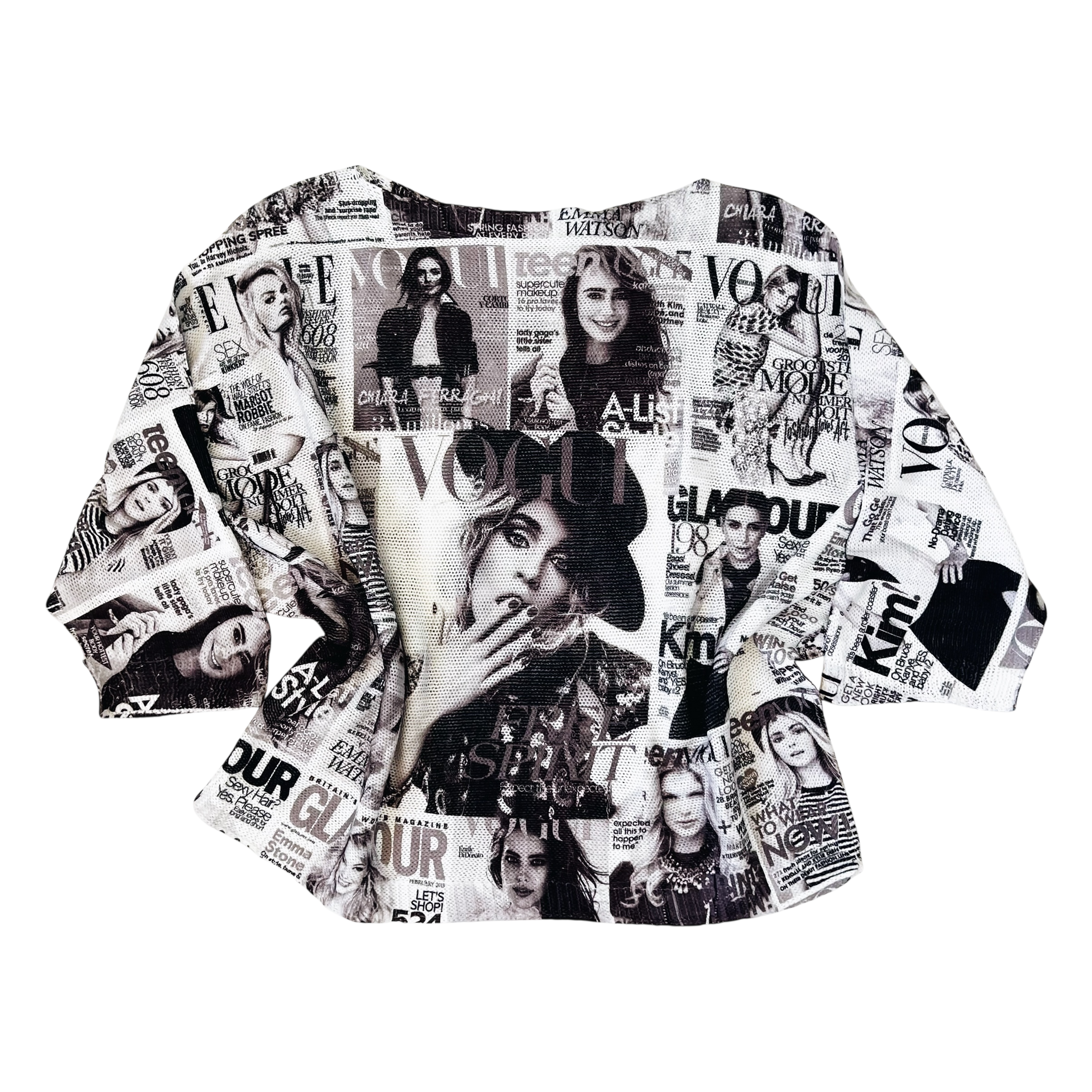 Italian knit sweater top featuring the coolest graphic magazine print!