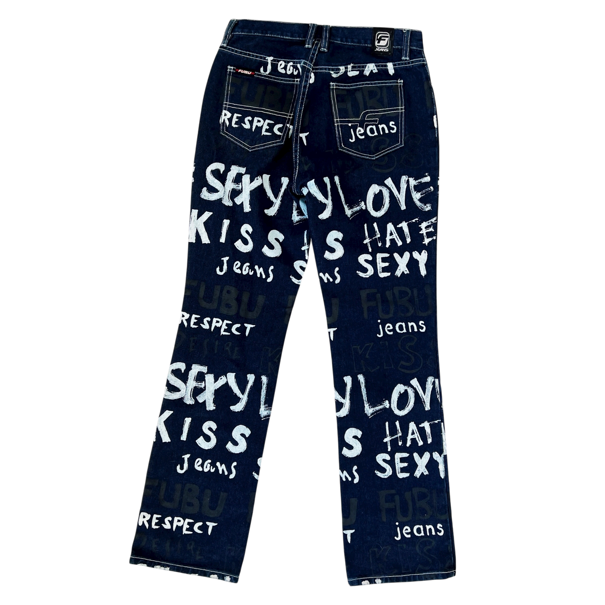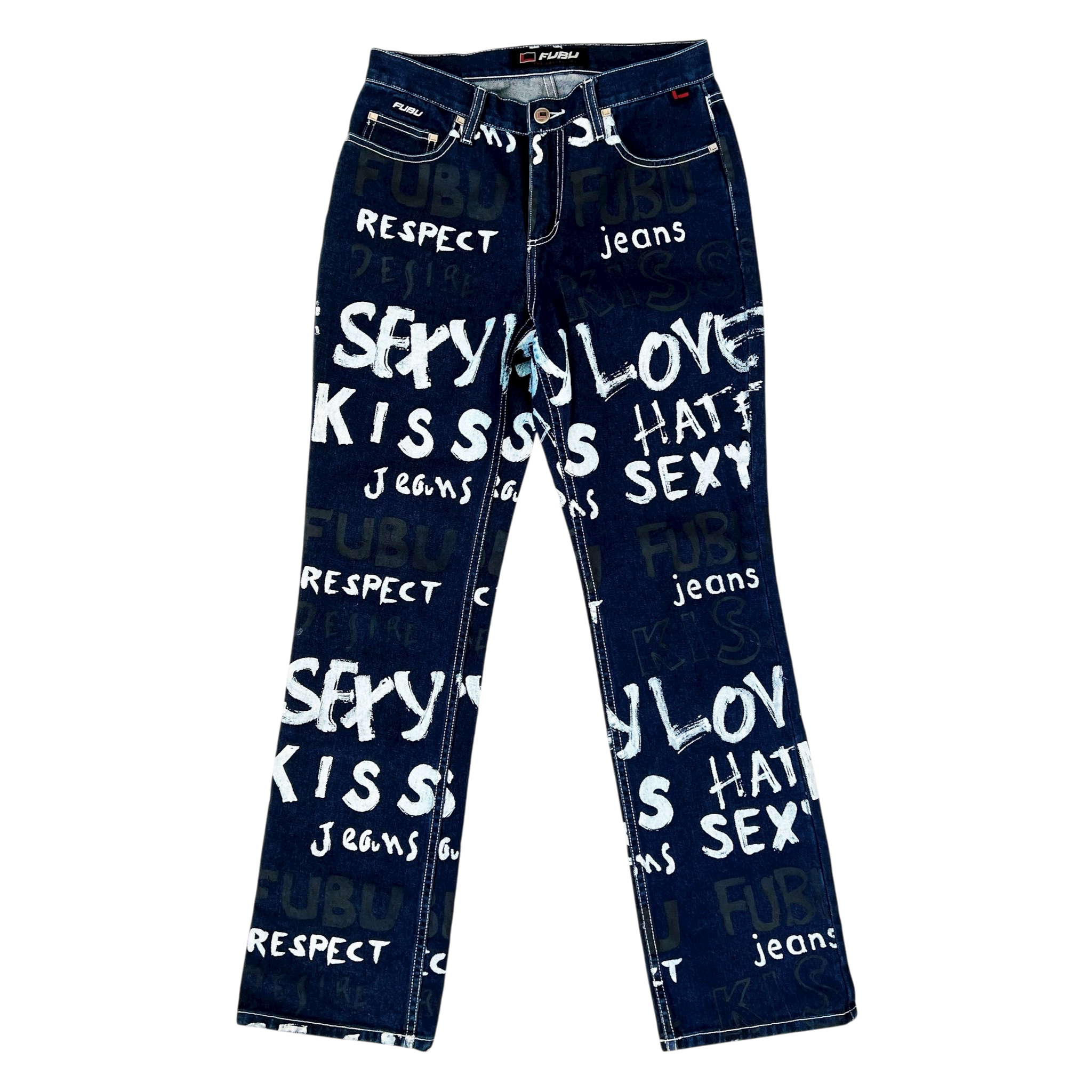 Early 2000s dark blue jeans covered in black and white graffiti details!