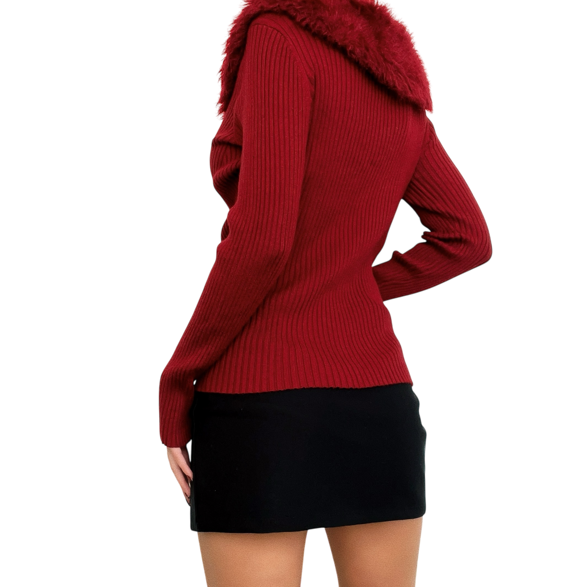 Burgundy/deep red ribbed knit zip up sweater top with a faux fur collar!